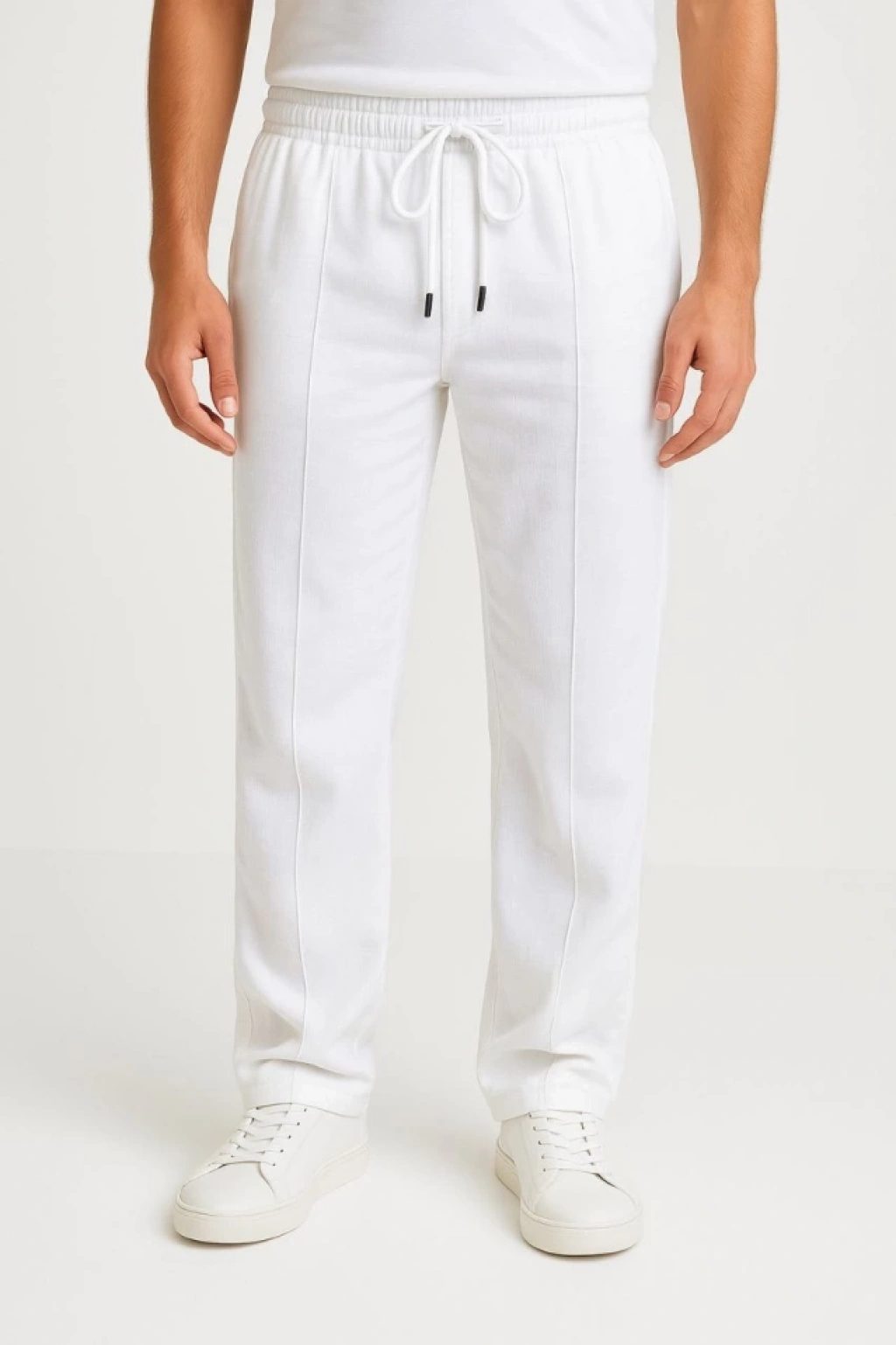 Erkek Keten Pantolon – Cepli, Beli Lastikli Ve Bağcıklı, Nefes Alan Rahat Kalıp, Yazlık Ve Baharlık Günlük Giyim, Şık & Konforlu Boru Paça Model - Beyaz