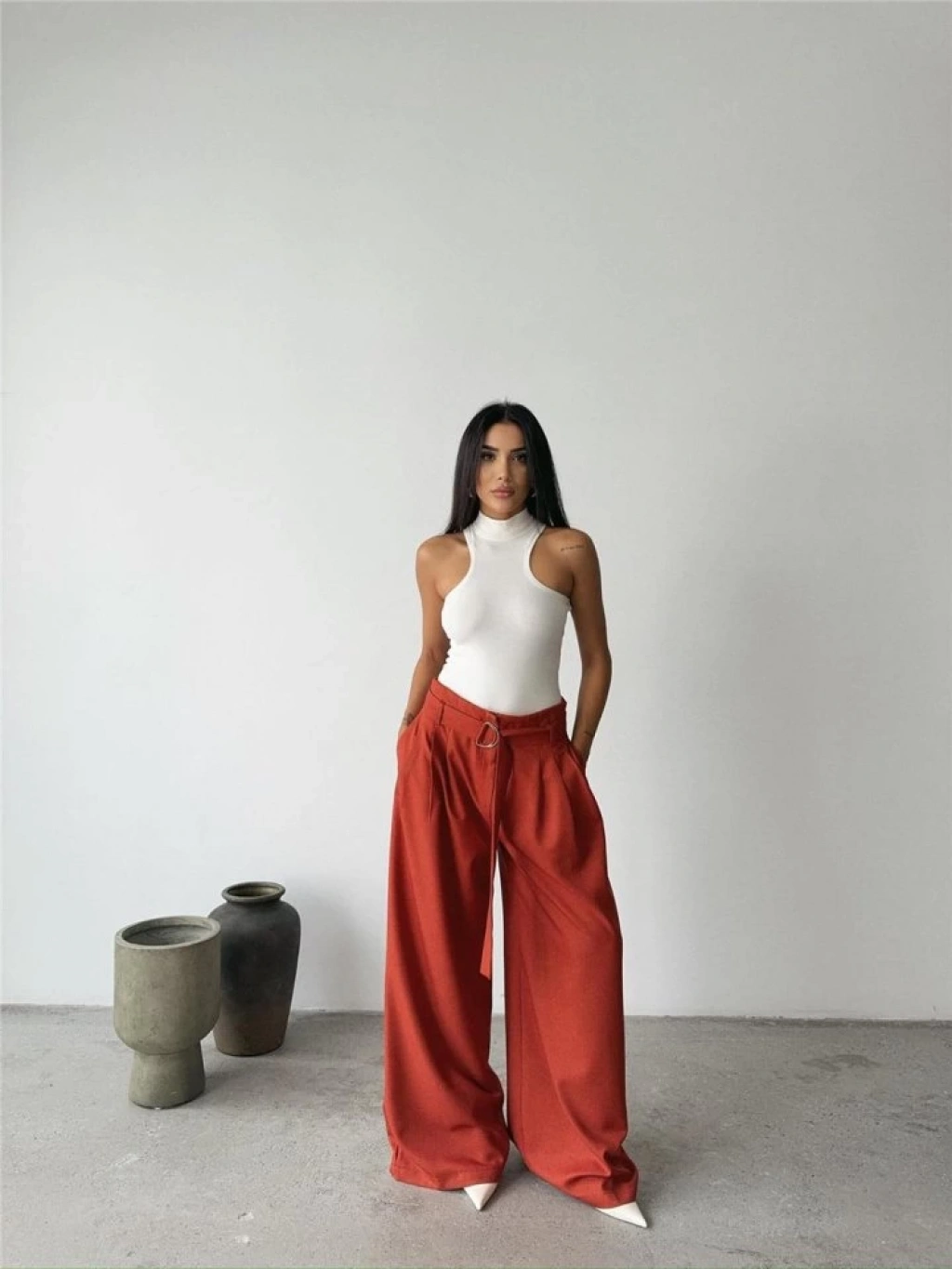 PALAZZO PANTOLON KUMAŞ KEMER DETAYLI - Kiremit