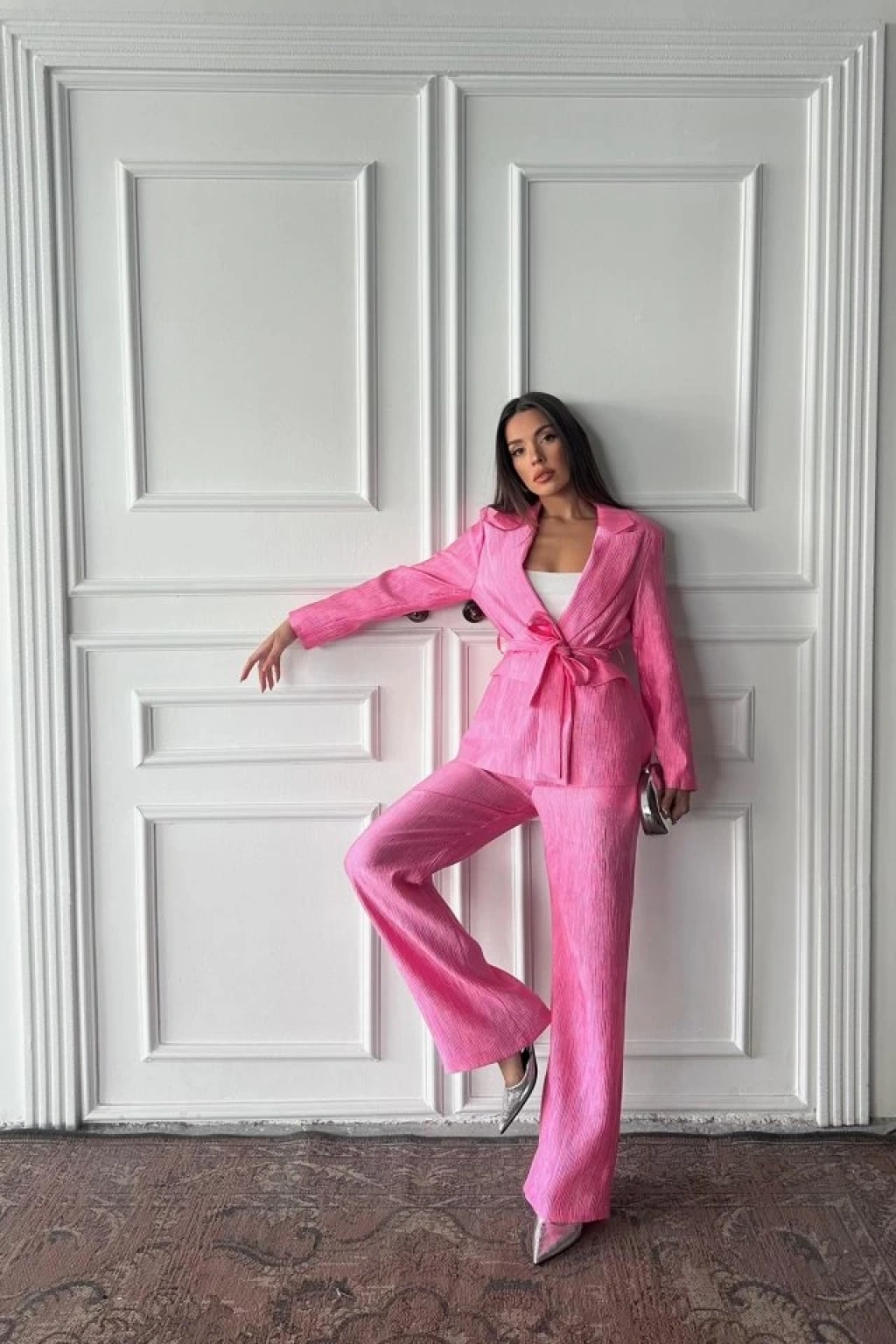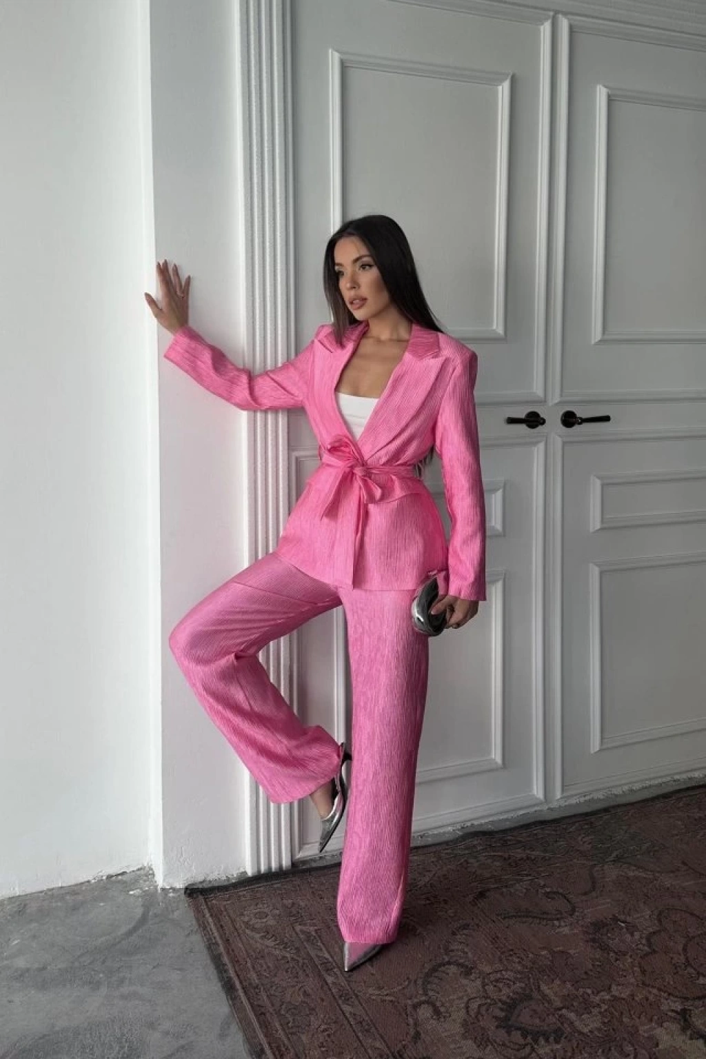 Pembe Beli Kuşaklı Ceket Ve Pantolon Parlak Takım