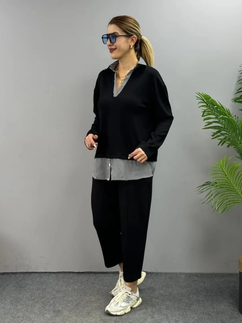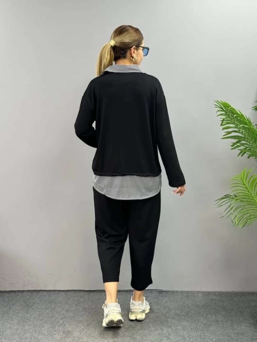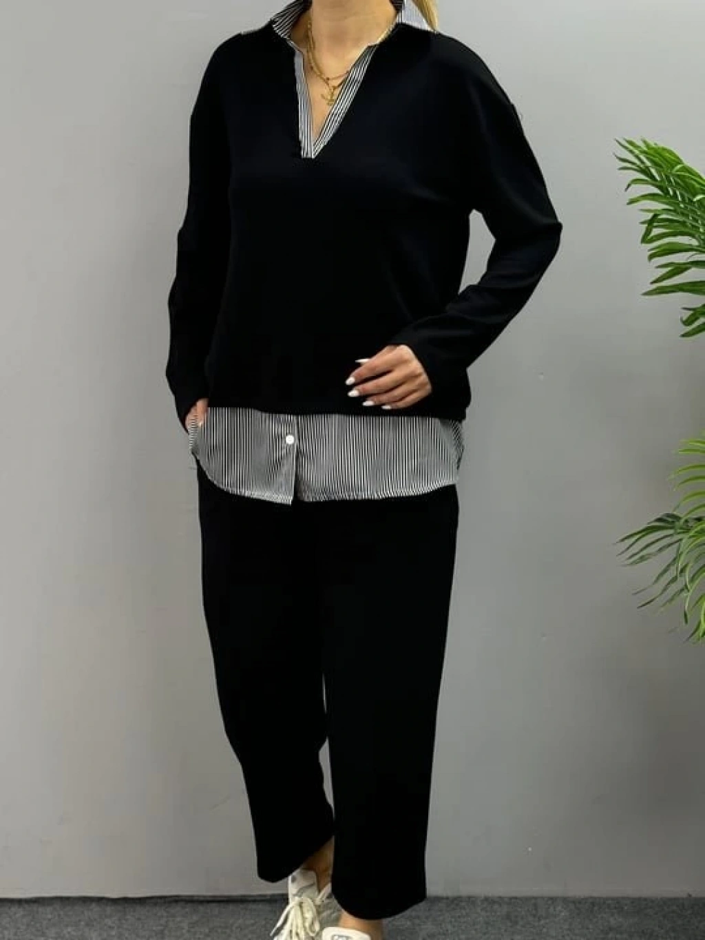 Polo Yaka Gömlek Detay Salaş Balon Pantolunlu ıkılı Takım