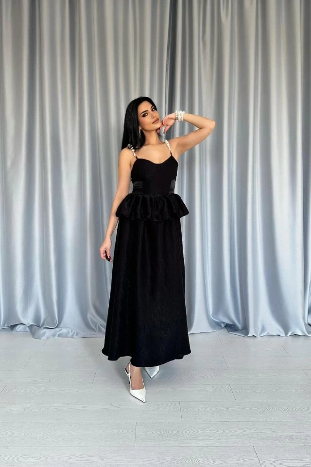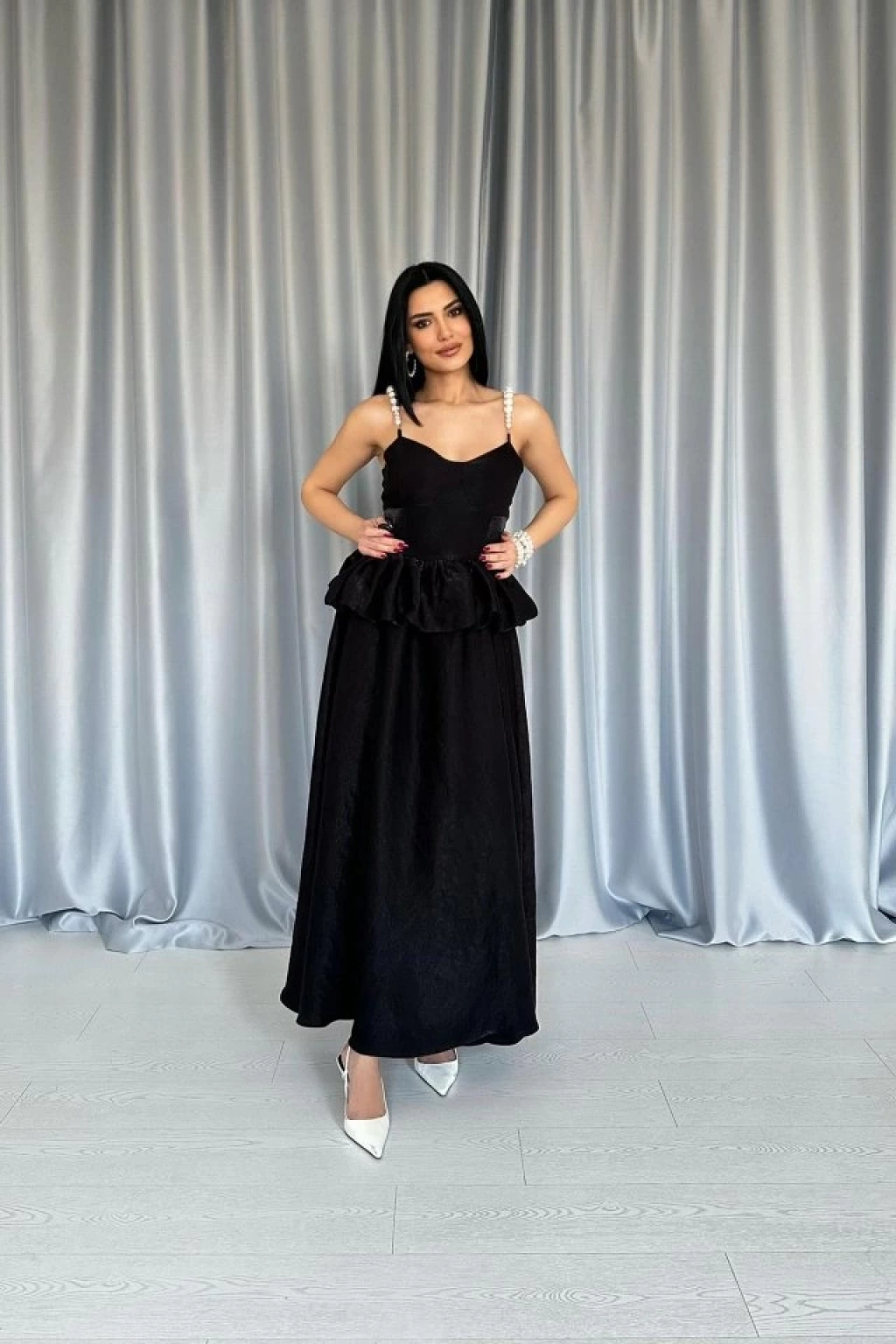 Siyah Beli Büzgülü İnci Askılı Uzun Elbise