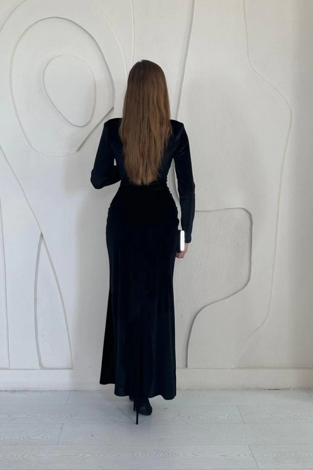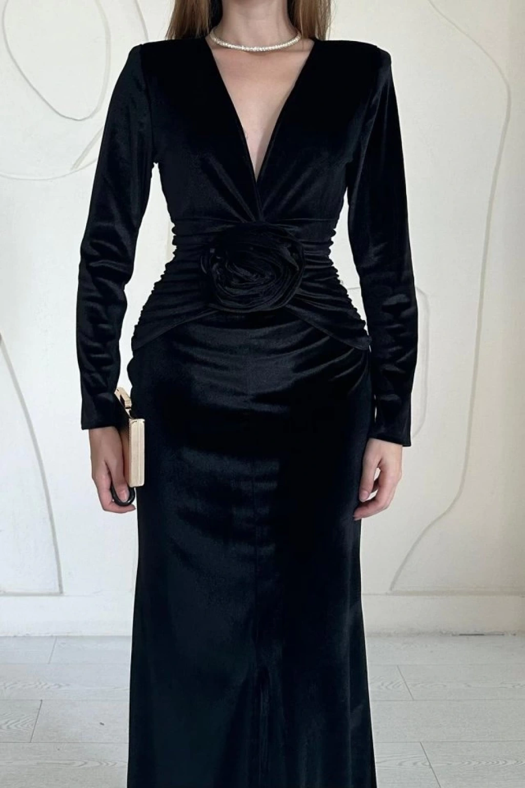 Siyah Önü Yırtmaçlı Güllü Elbise