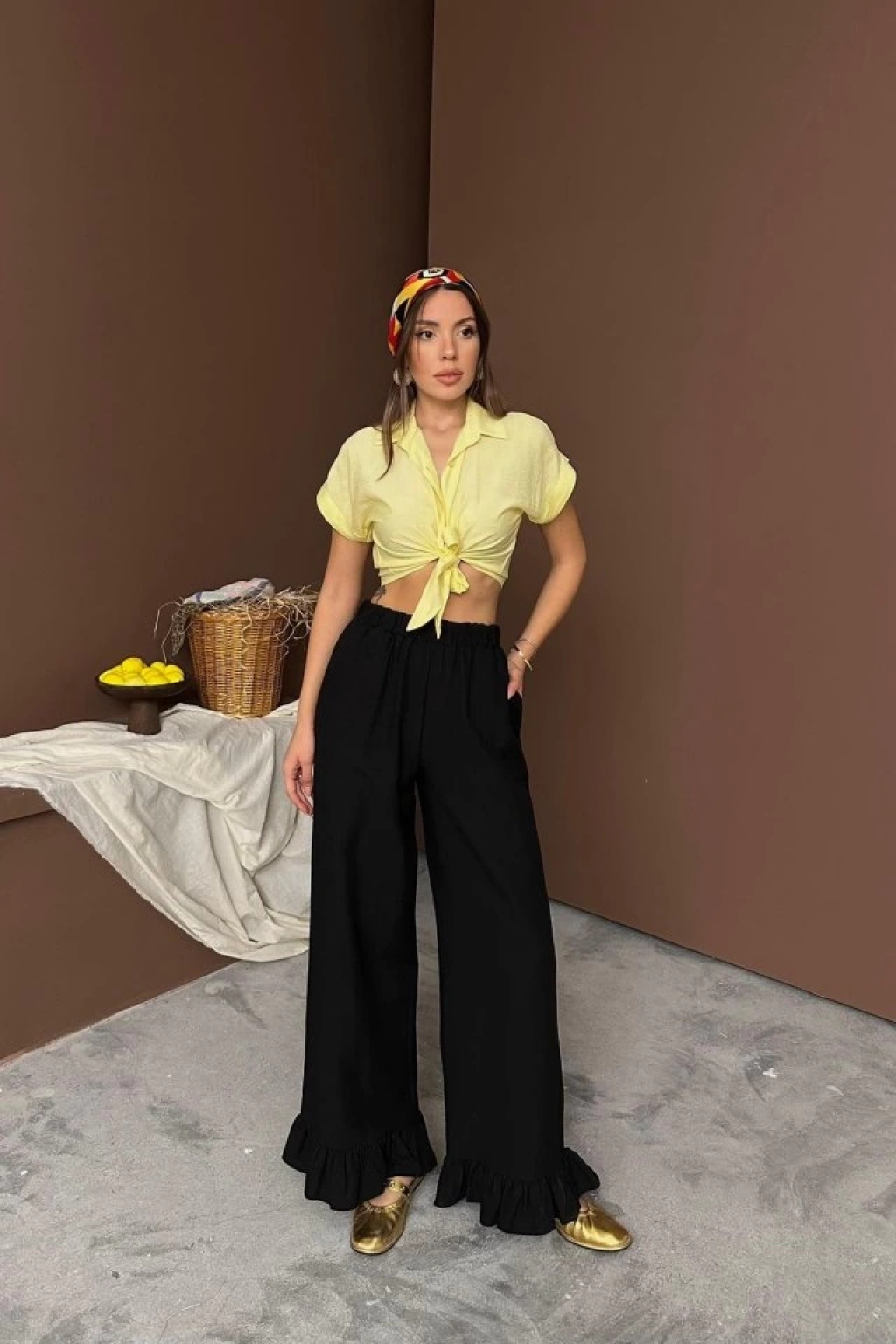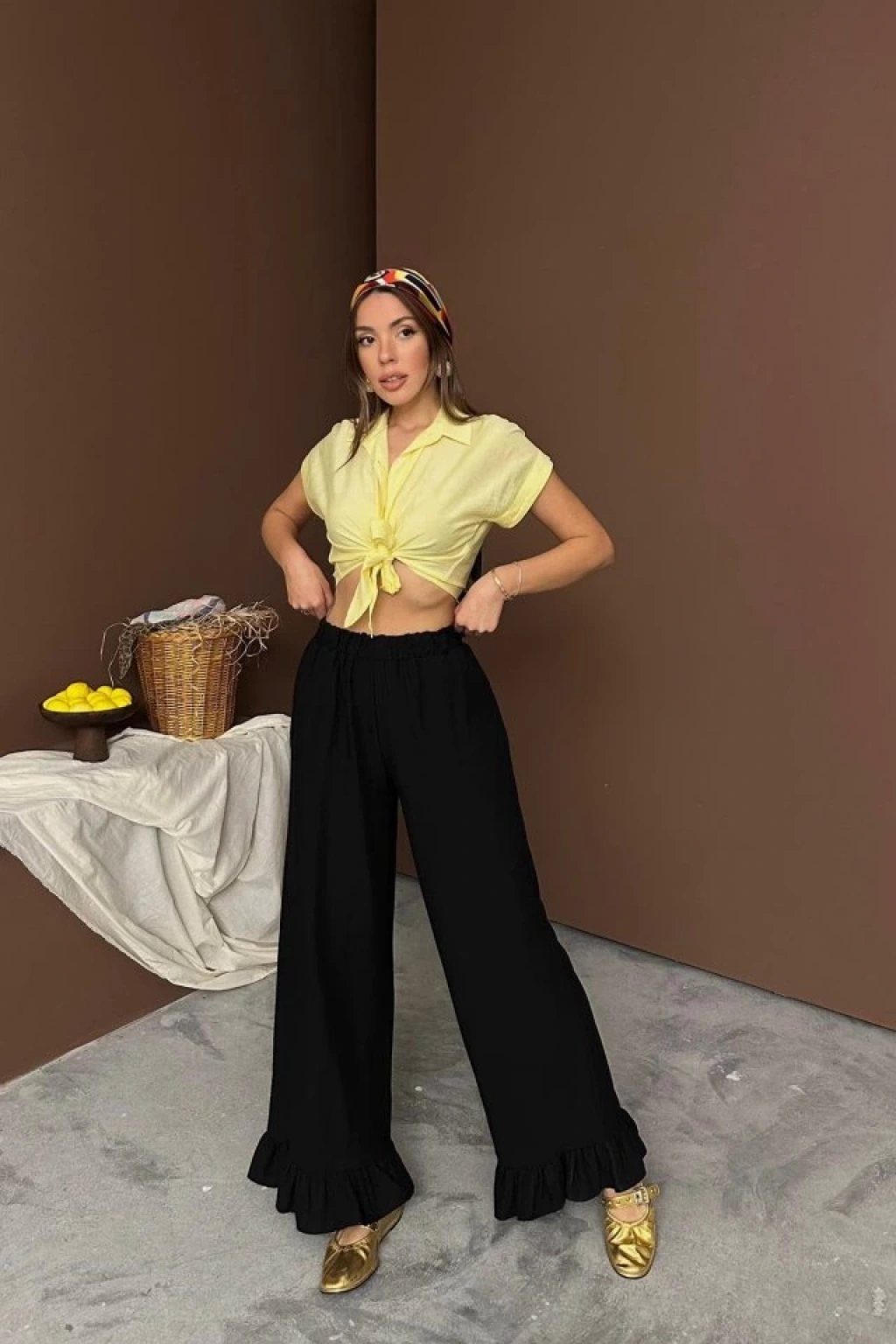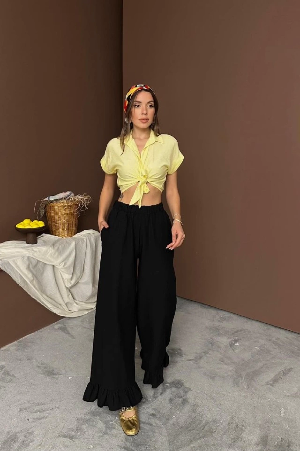 Siyah Paçası Fırfırlı Keten Pantolon