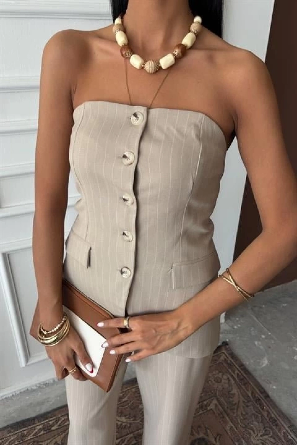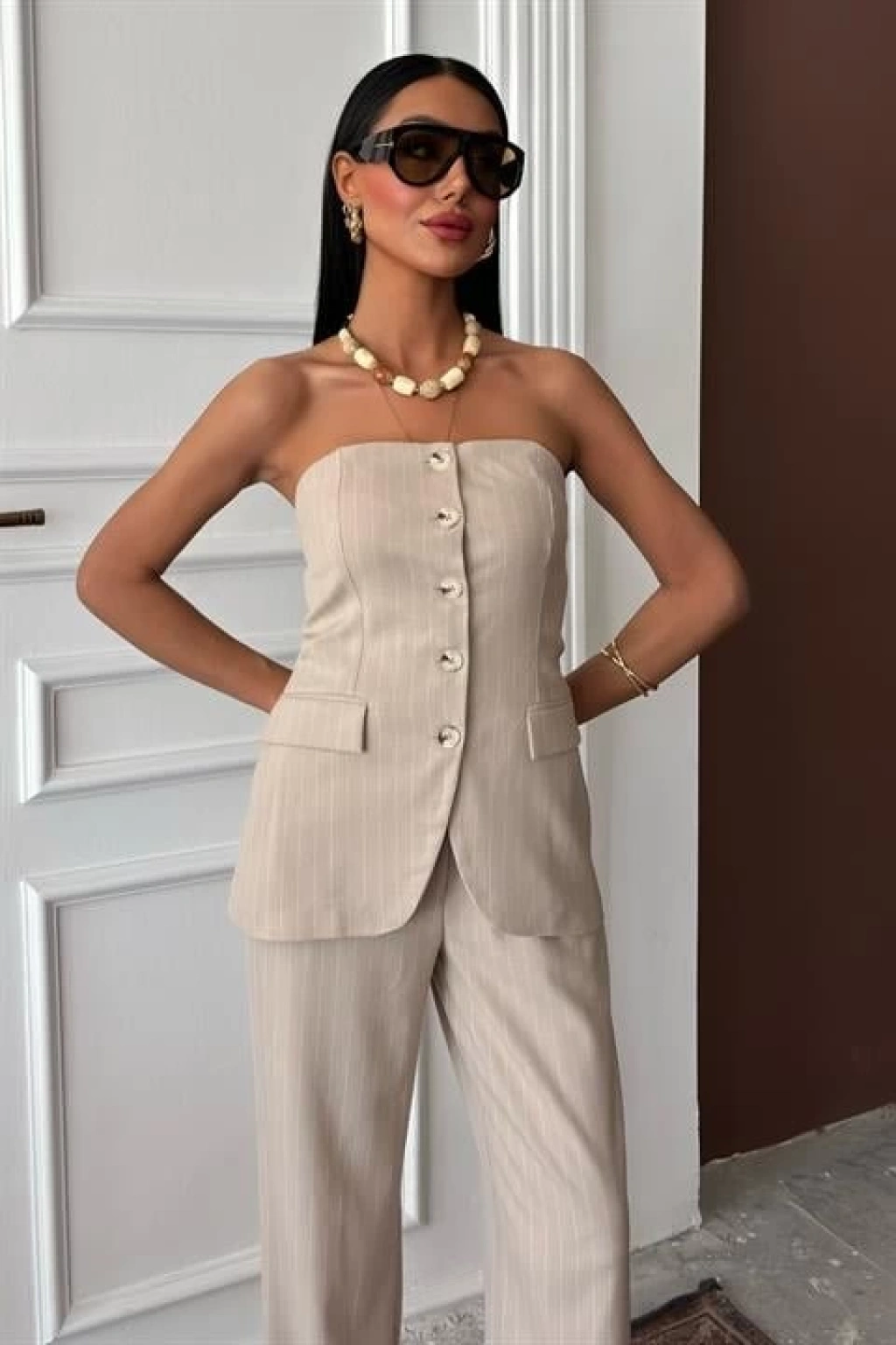 Straplez Büstiyerli Plazzo Pantolonlu Çizgili Takım 10151