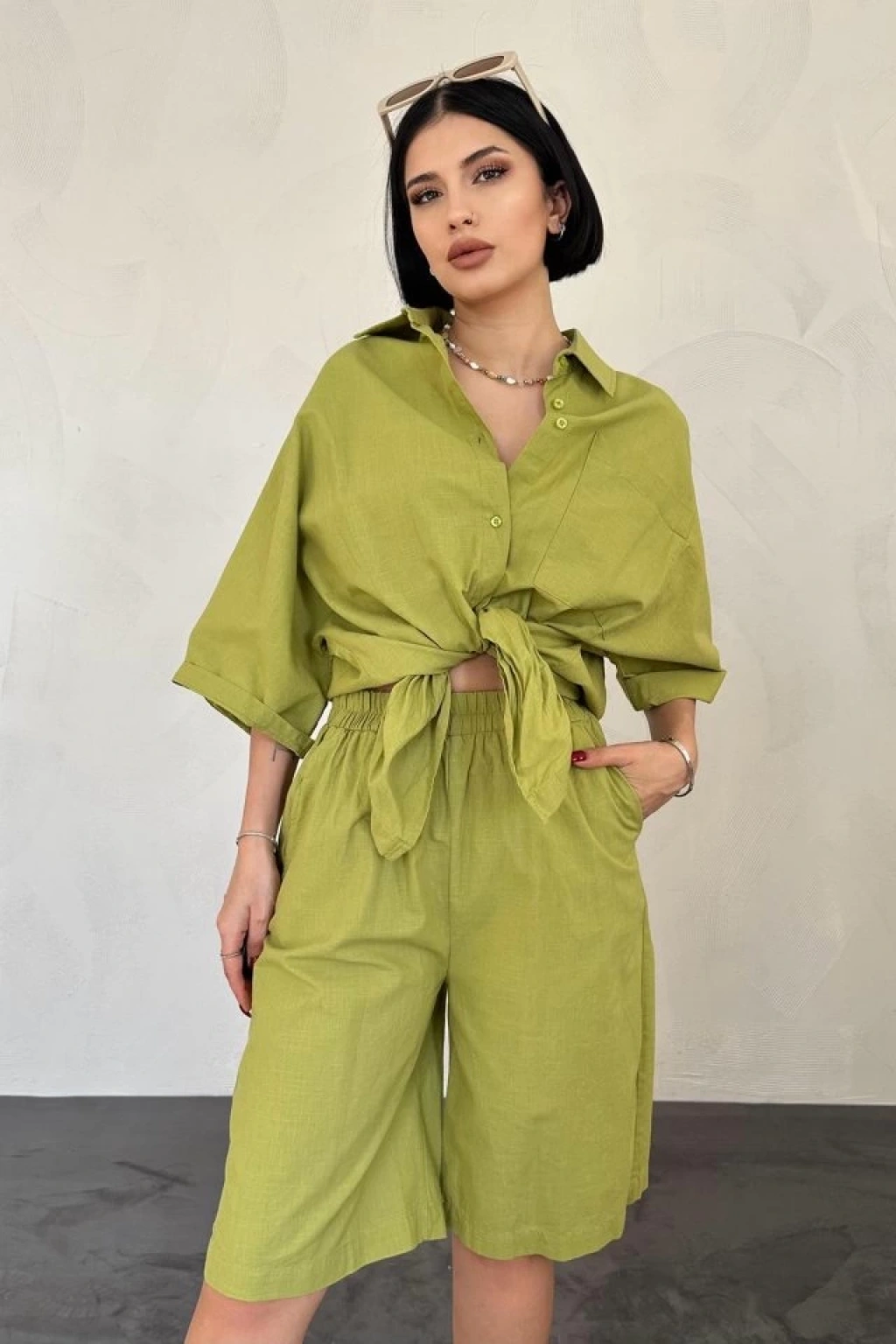 Yağ Yeşili Kısa Kollu Keten Gömlek Ve Şort Takım