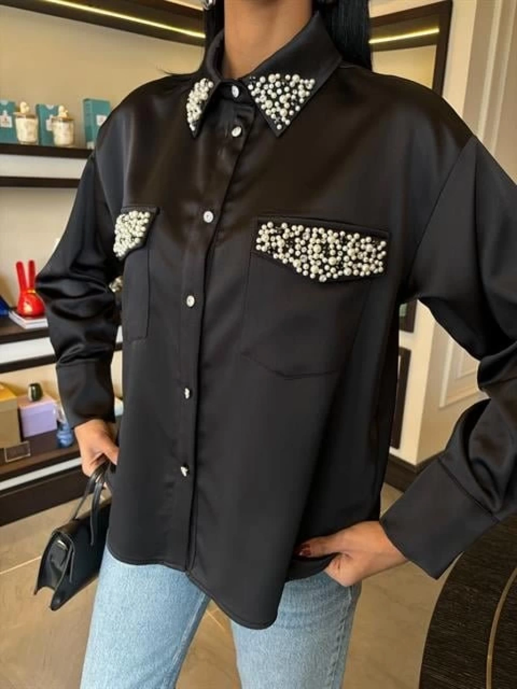 Yaka Ve Cep İnci Taşlı Saten Gömlek 3423