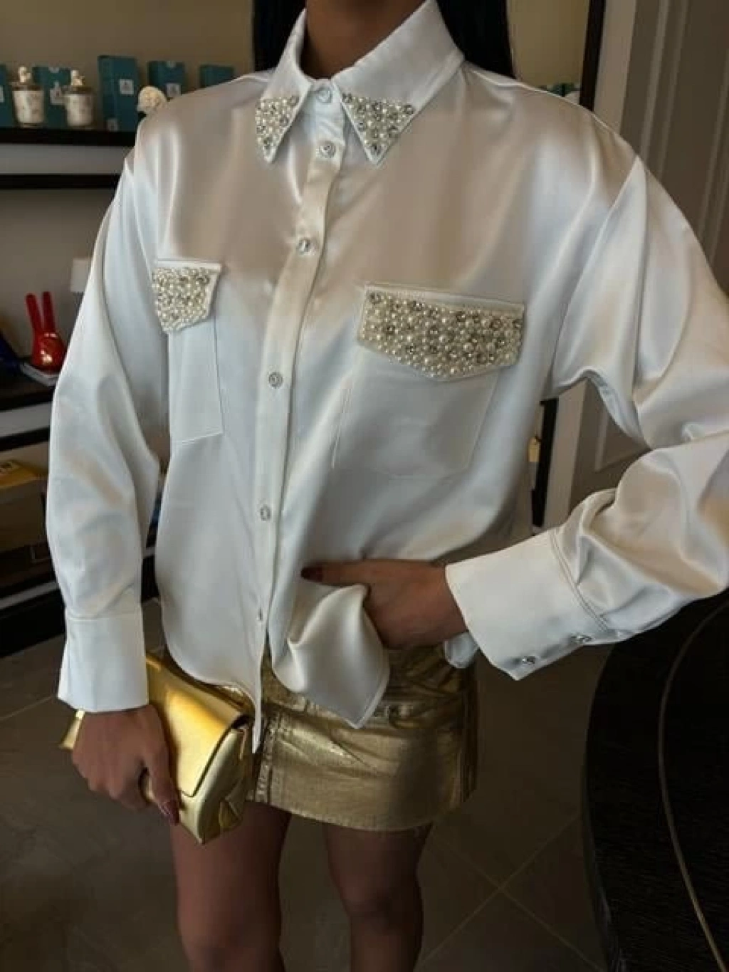 Yaka Ve Cep İnci Taşlı Saten Gömlek 3423