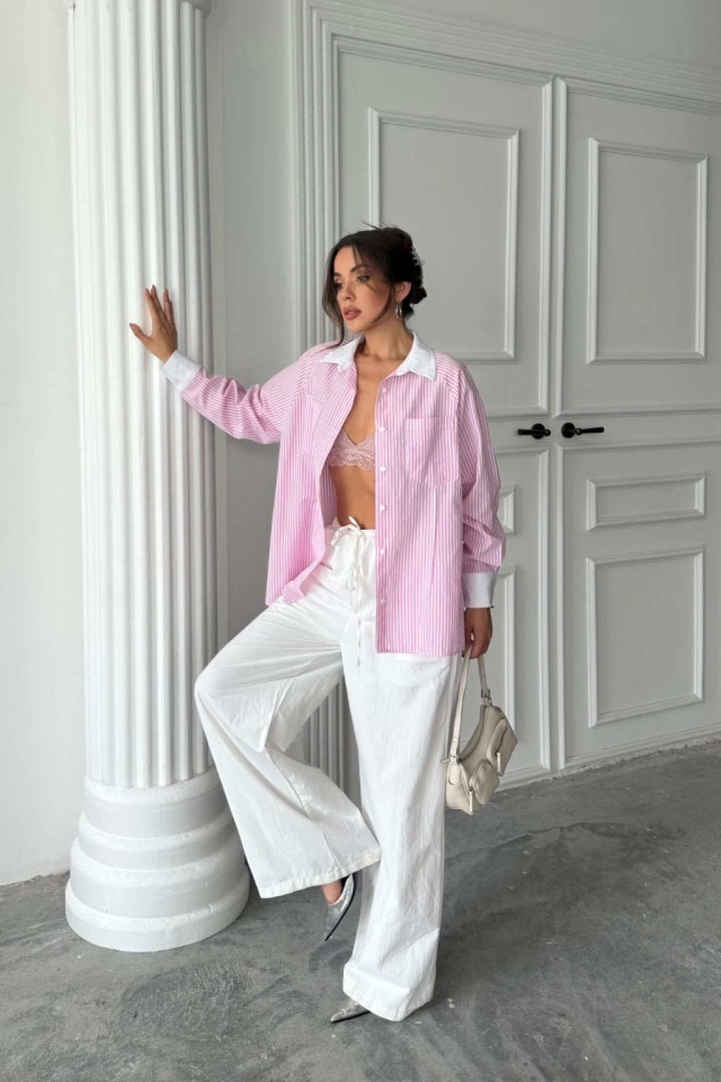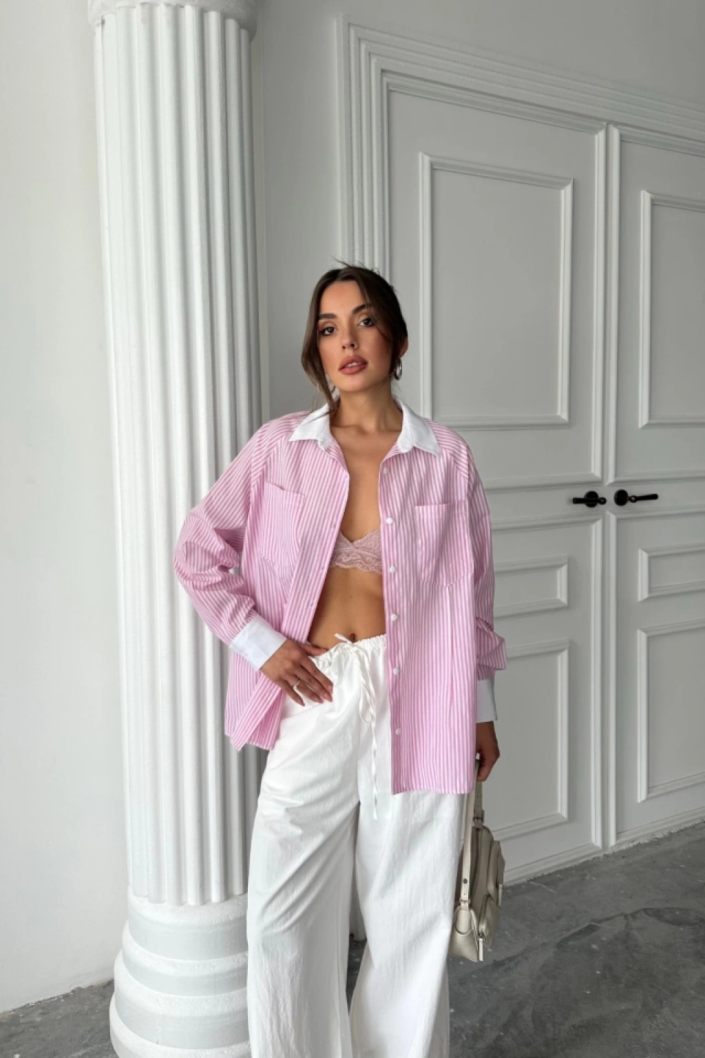 YAKA VE MANŞET BEYAZ BOYFRİEND ÇİZGİLİ POPLİN GÖMLEK - Pembe