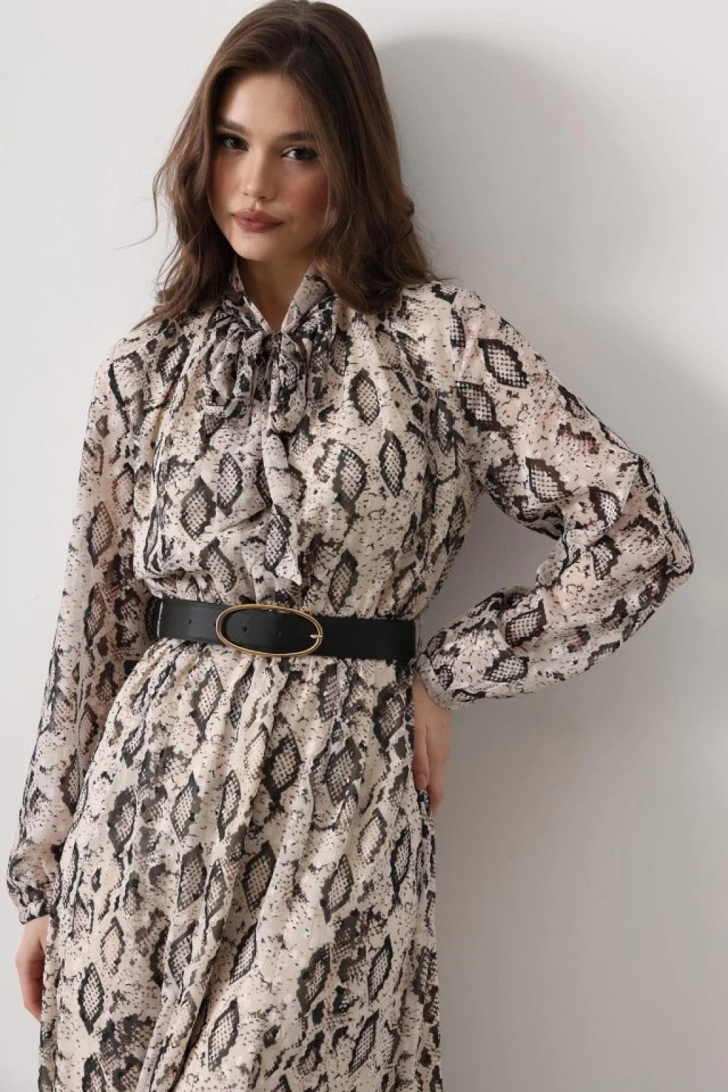 Yılan Desen Uzun Yaka Detaylı Elbise - Krem-Siyah
